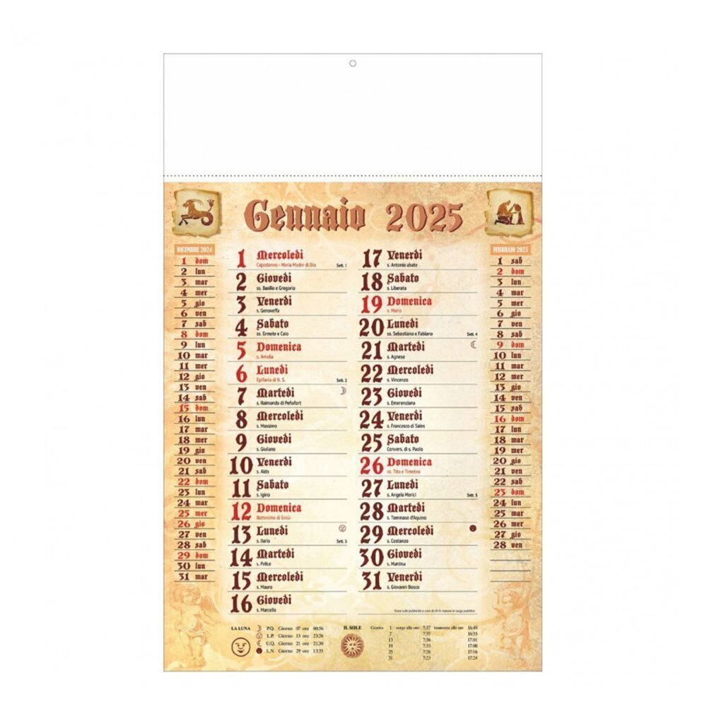 La stampa avviene solo sulla parte superiore (testata) del calendario. L’interno illustrato è già prestampato con immagini, festività e griglia mensile.