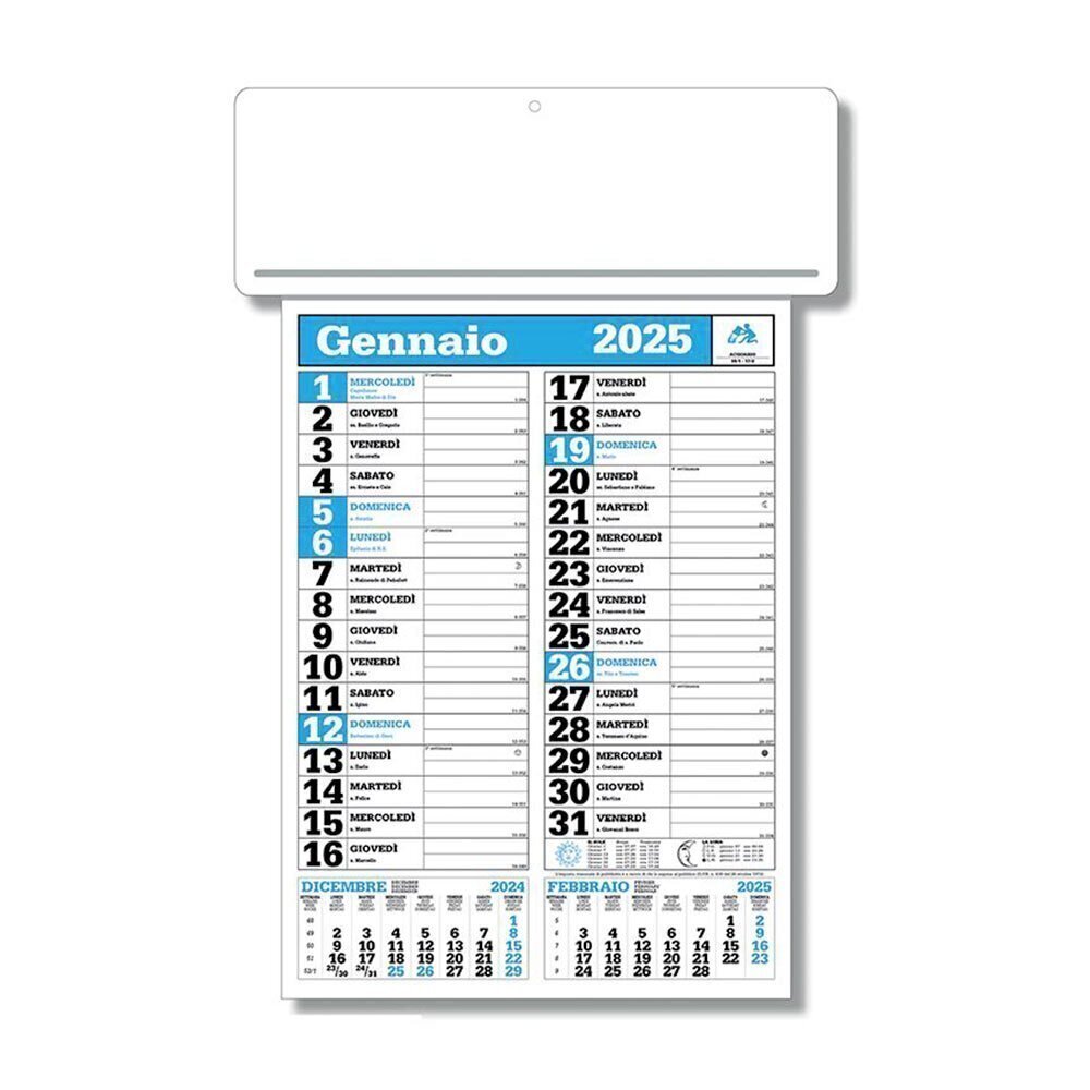 OLANDESE PASSAFOGLIO Calendario mensile 12 fogli, Carta patinata opaca 90gr. Testata doppio strato rinforzata. Allestimento con astina metallica. Dimensione Calendario 34 x 55 cm - Dimensione Testata cm 34 x 9 cm.