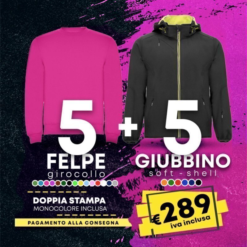 • Quali sono i capi in offerta? T-shirt 100% cotone, felpe unisex, polo resistenti e giacche leggere da stampare o ricamare.