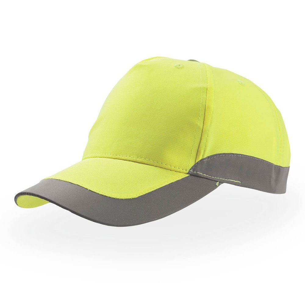 Visiera con bordo a contrasto. Chiusura a strappo con cinturino in materiale riflettente.