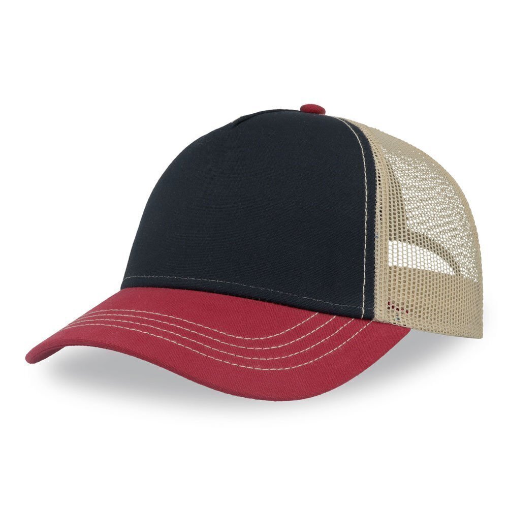 Modello trucker per il tempo libero, in tela di poliestere riciclato sulla crown e rete in poliestere riciclato su lato e retro. Forma a 5 pannelli e visiera mid.