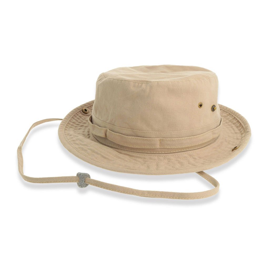 Non pu˜ mancare dentro lo zaino del viaggiatore questo indistruttibile cappello con tesa, in forte canvas di cotone reso supermorbido dal sapiente lavaggio ad enzimi. Doppia band laterale, occhielli e bottoni a pressione in ottone anticato, sottotesa a contrasto per esaltarne la versione western. Confortevole il laccio in cordino di canvas.
