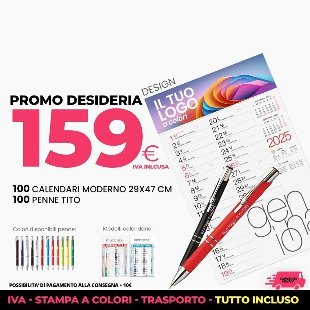Approfitta della nostra offerta speciale che include il Calendario e la Penna Tito 2025 personalizzabili a un prezzo competitivo. Questa promozione comprende la stampa a colori, il trasporto e tutto il necessario per personalizzare i tuoi gadget aziendali.