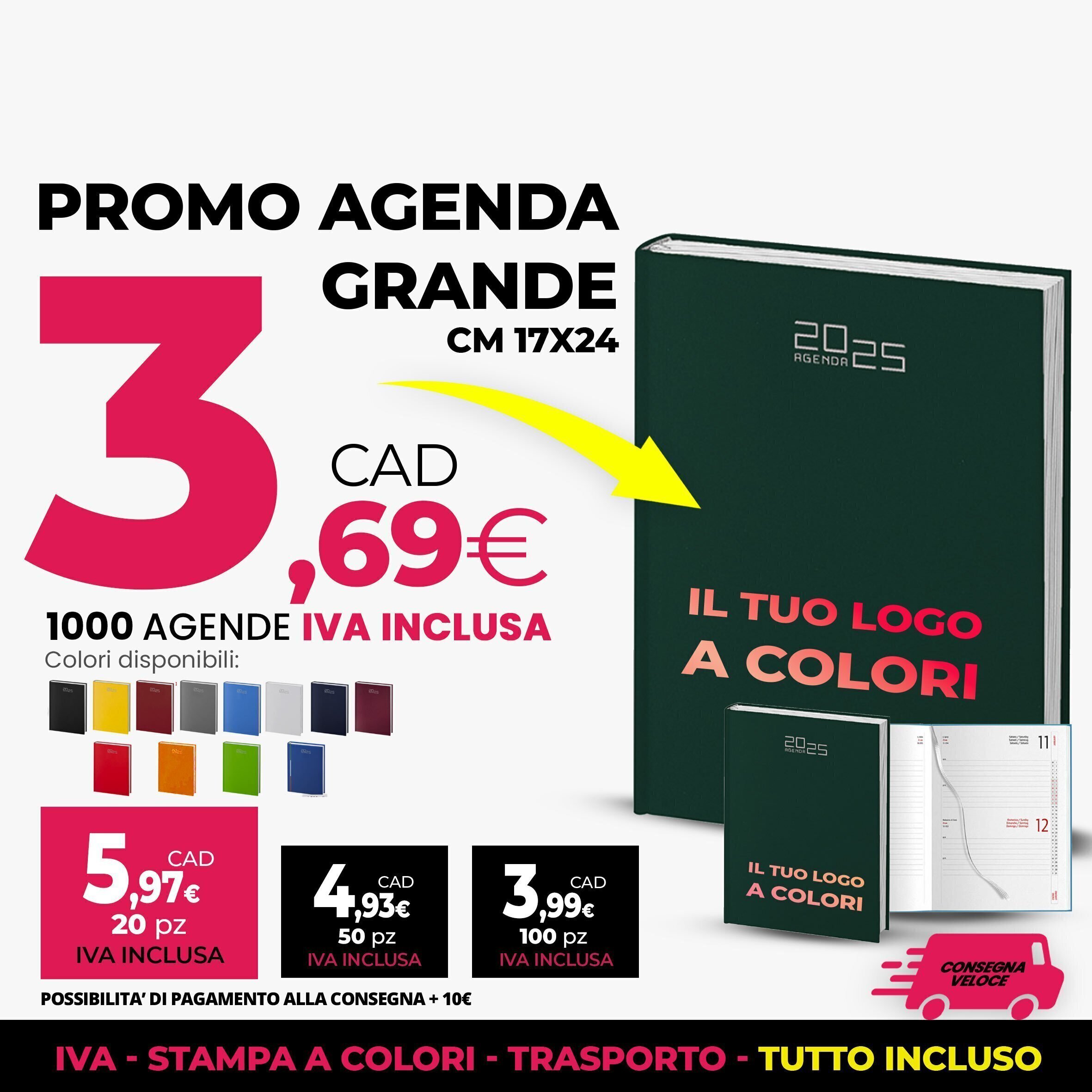 Scopri la Promozione Agende Grandi 2025! Un'agenda in formato 17x24 cm, ideale per organizzare al meglio i tuoi impegni quotidiani. Disponibile in vari colori e personalizzabile con il tuo logo a colori. Perfetta per uffici, regali aziendali o gadget promozionali. Offerta speciale: 1000 agende a soli 3,69€ CAD, IVA inclusa! Possibilità di pagamento alla consegna con un supplemento di 10€. Affrettati, la promozione è valida per un periodo limitato!